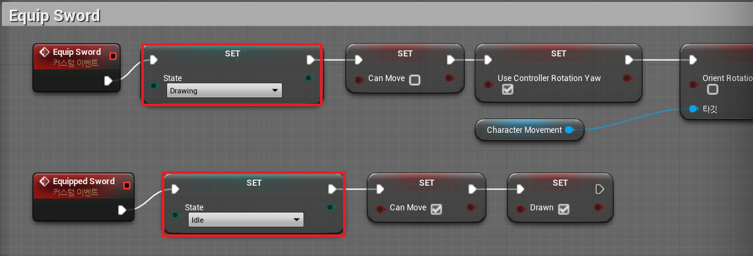 4. BP_Player > Sword Event > "Equip Sword"을 set "State"를 활용하여 다음과 같이 세팅하여 준다.