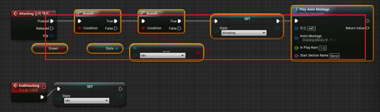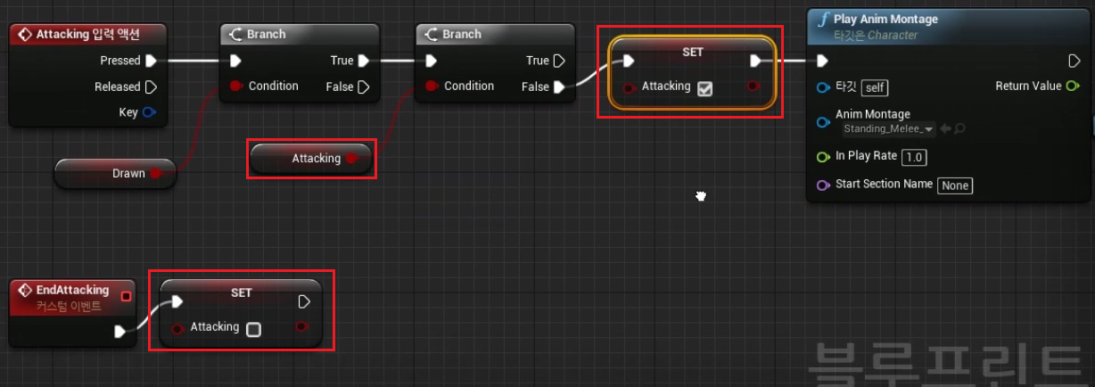 7. BP_Player > "Attacking Event" 를 다음과 같이 세팅하여 준다.