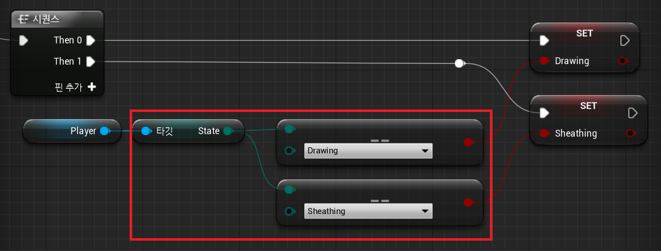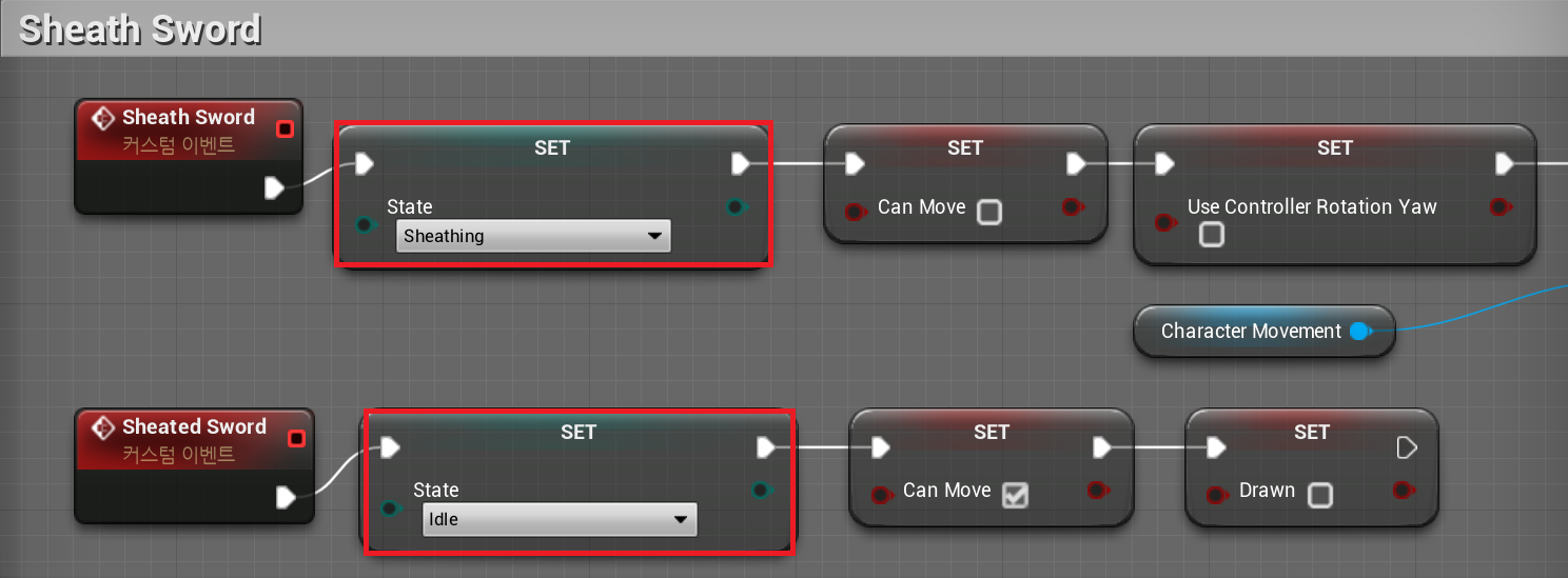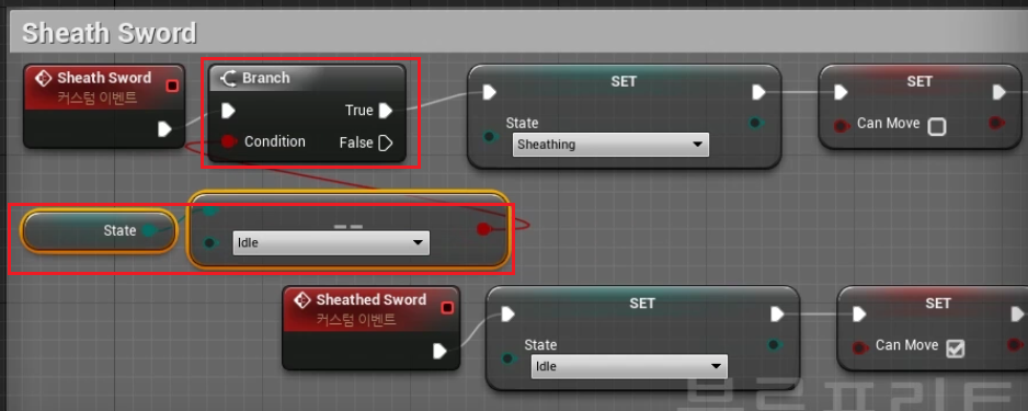 5. BP_Player > Sword Event > "Sheath Sword"을 set "State"를 활용하여 다음과 같이 세팅하여 준다.