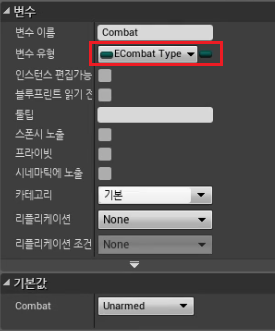 1) BP_Player > "Combet" ECombat Type형 변수 생성
