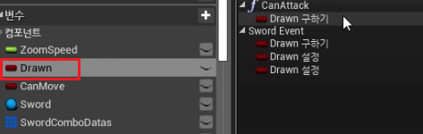 "Drawn" 변수의 경우 칼을 쥐고 있는 상황이기 때문에 다음과 같이 Set Combet 하여 Sword 모드로 연결