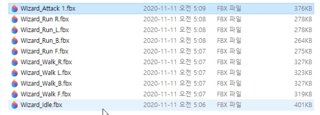 4. "Animation" 폴더에 "Wizard" 폴더를 생성하고, 임포트 된 애니메이션들을 "애님 에셋 리타겟" 하여 "Wizard" 폴더에 넣어준다.