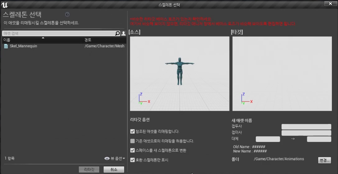 3. Unreal Animation 으로 변환하여 임포트 하여준다.