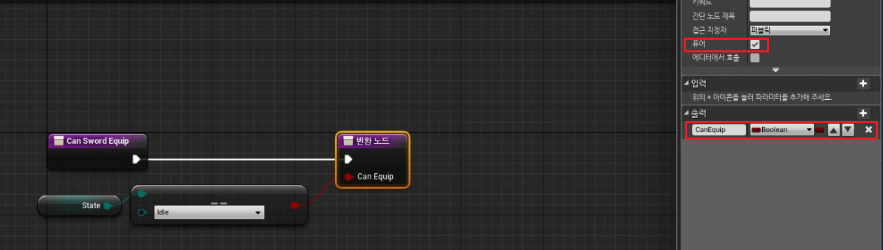 다음과 같이 세팅하고, 반환노드에 "CanEquip" Boolean 형 리턴값 만들어 주기, 및 퓨어 처리