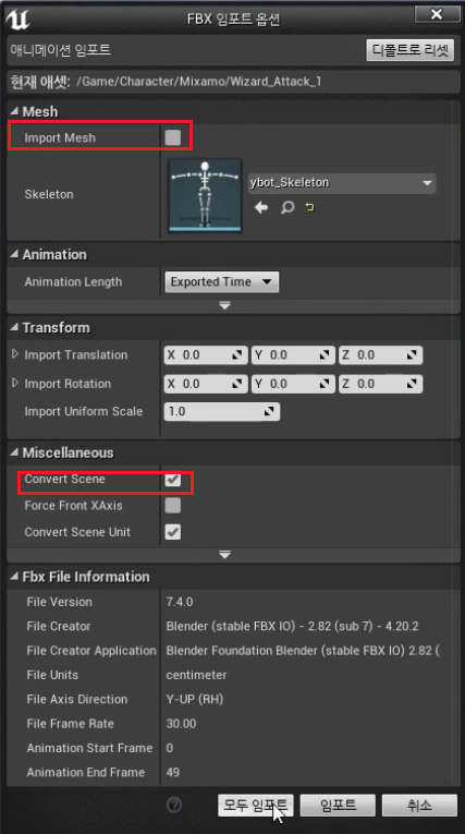 * Import Mesh 는 체크 해제, Convert Scene 은 체크하여야 한다.