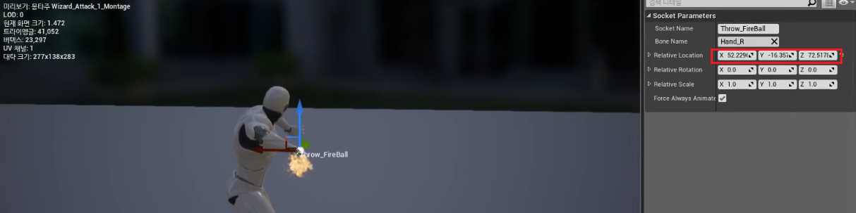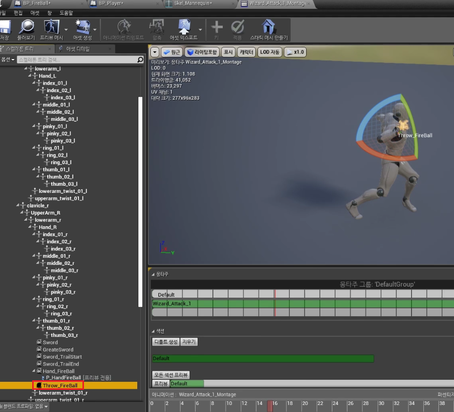 5. Wizard Attack_1_ Montage > 스켈레톤 트리 > Hand_R > 소켓추가, "Throw_FireBall" Rename