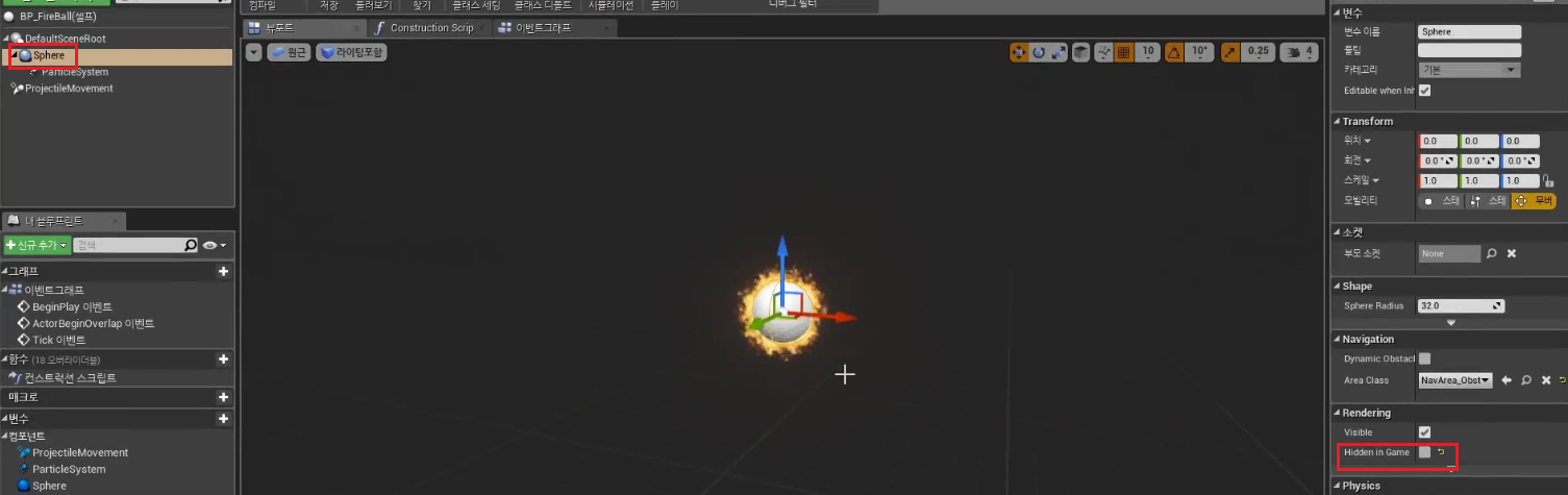 1. BP_FireBall > Sphere > Rendering > Hidden in Game (Collsion 인게임에서 보이게 하기)
