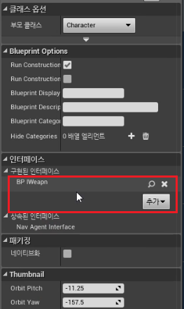 다음과 같이 부모 클래스도 바꿀수 있고, 인터페이스도 넣어줄 수 있다. BP_Iweapon 인터페이스를 넣어준다.