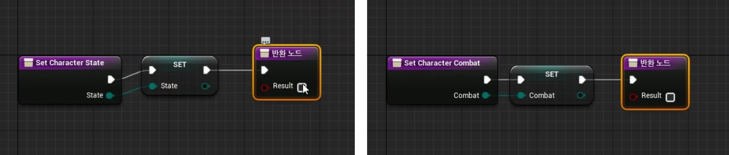 BP_Enemy, BP_Player > 인터페이스 Set Character Combat, Set Character State 다음과 같이 세팅
