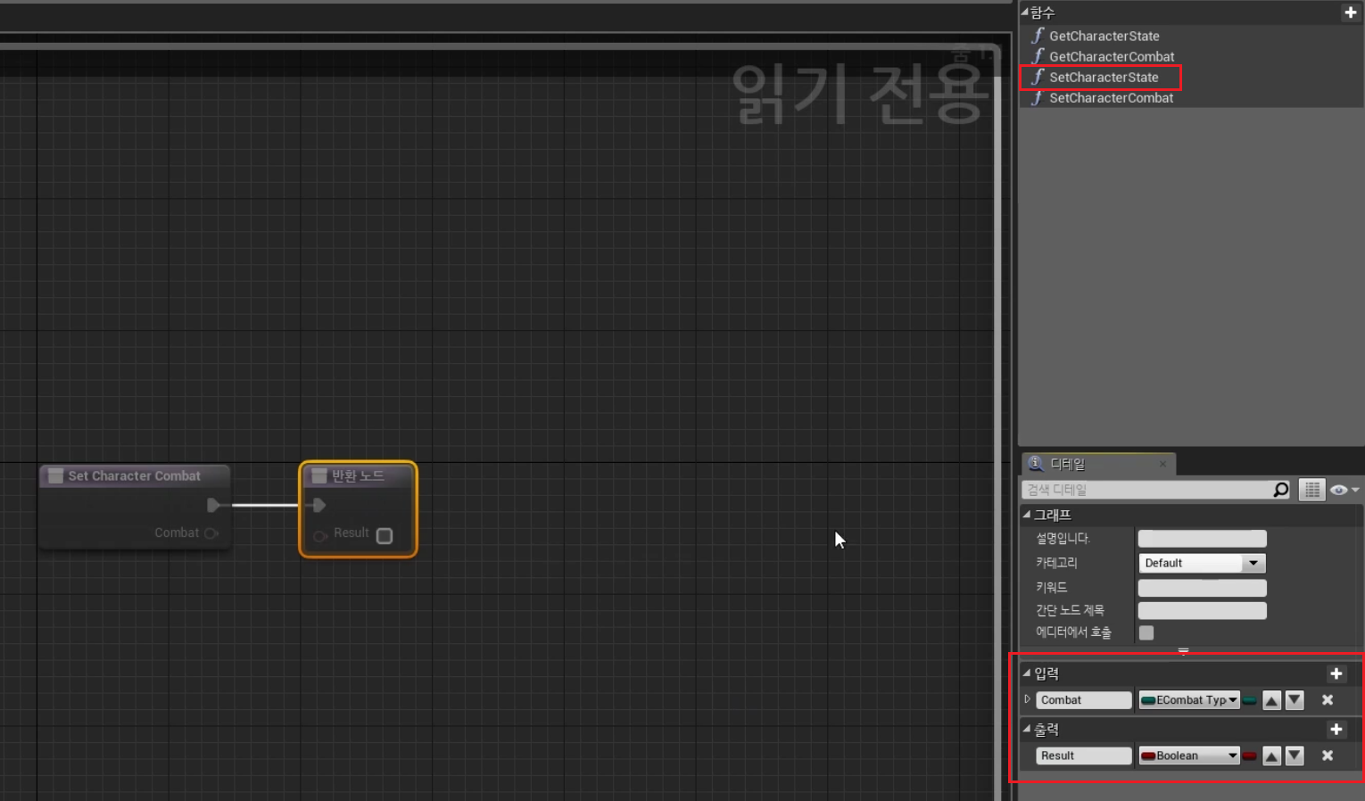 "Set Character Combat" 함수 생성 > 출력에 E Combat Type "Combat" 추가 > 다음과 같이 세팅