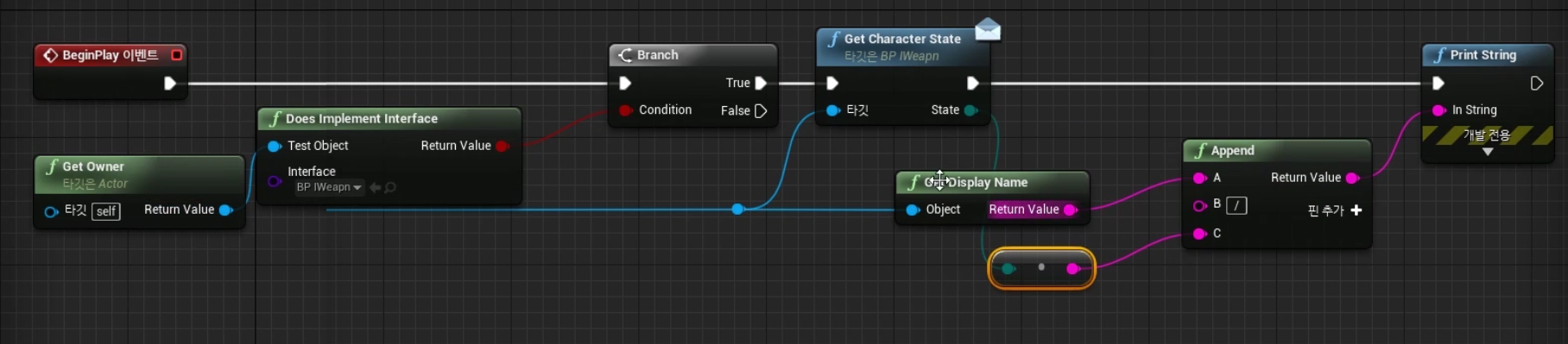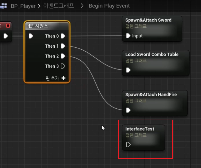1) BP_Player > 이벤트그래프 > Begin Play Event > 노드접기 "InterfaceTest" Rename, 노드 끊어놓기