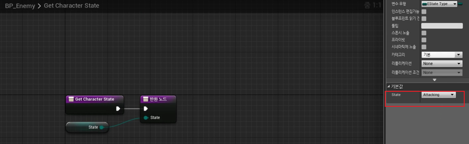 2. BP_Enemy > Get Character State > State - "Attacking" 으로 변환