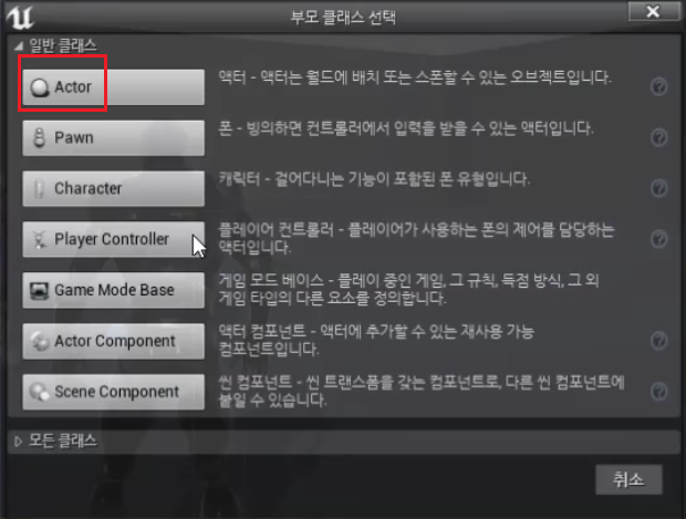 1. 블루프린트 클래스 > Actor 생성 > "BP_InterfaceTest" Rename