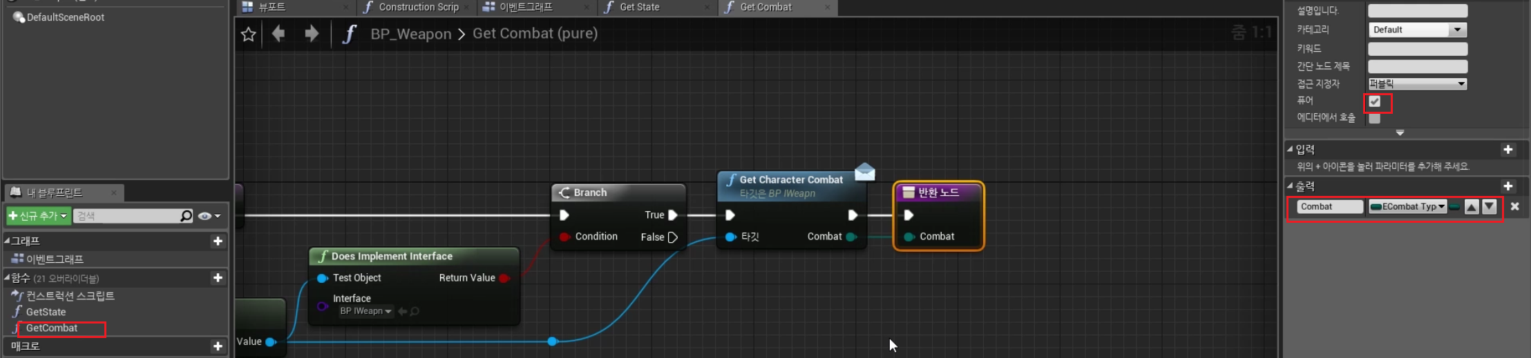 5. 함수 "GetCombat" 생성, GetState 함수에서 복사하여 다음과 같이 생성, 퓨어 활성화