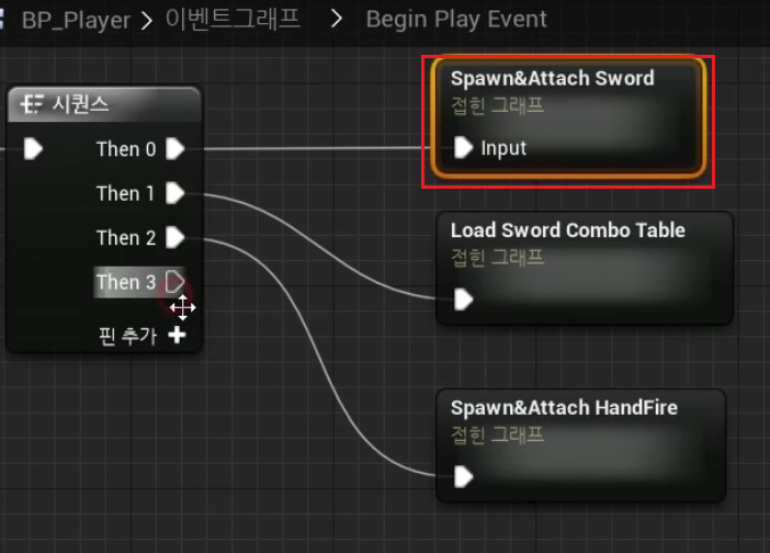 4. BP_Player > 이벤트 그래프 > Begin Play Event > 다음 부분 노드접기 > "Spawn&Attach HandFire" Rename
