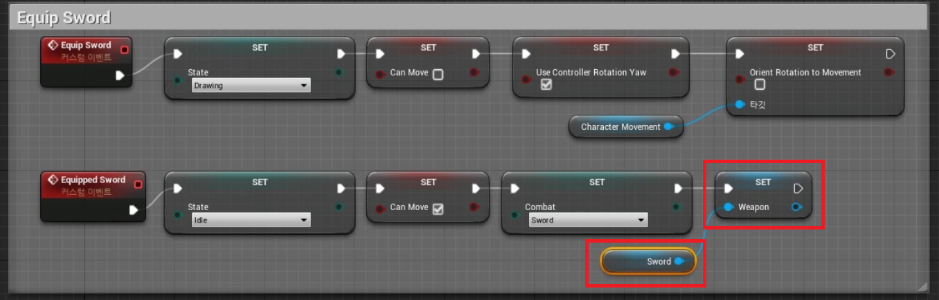 1) BP_Player > 이벤트 그래프 > Sword Event > Equip Sword > 다음과 같이 세팅
