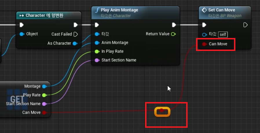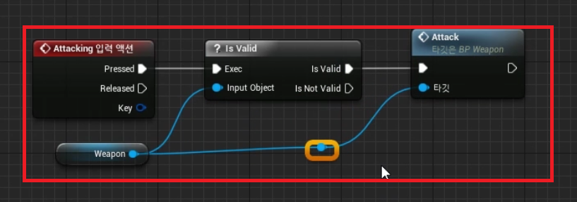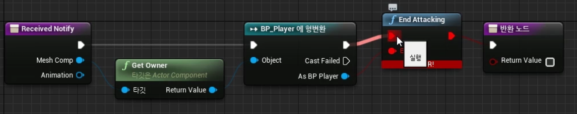 End Attacking 이 이제 BP_Player 에 들어있지 않아 오류가 발생한다. BP_Weapon 에서 가져와 주어야 한다.