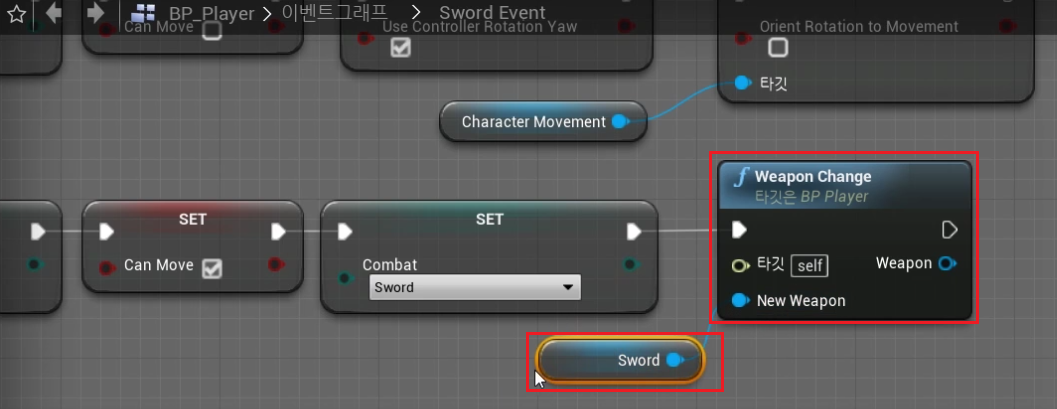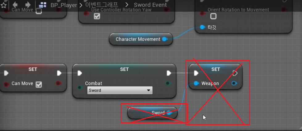 9. BP_Player > 이벤트그래프 > Sword Event > 다음부분 삭제, 아래와 같이 세팅