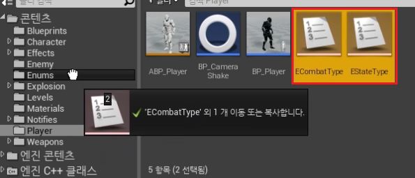 4) 콘텐츠 > "Enums" 폴더 생성 > "Player" 폴더 다음 두가지 "Enums" 폴더로 이동