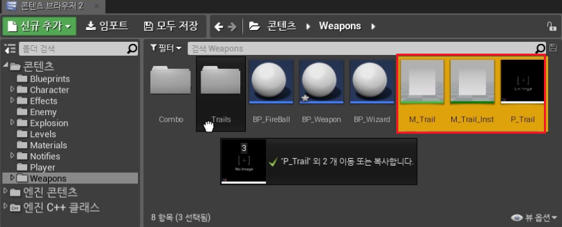 2) Weapons > "Trails" 폴더 생성 > 다음 세 가지 "Combo" 폴더로 이동