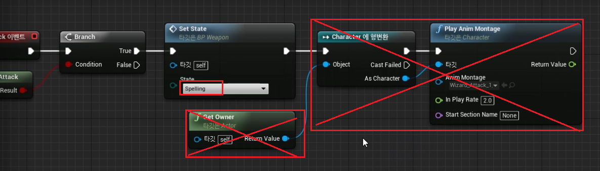 4. BP_Wizard > 이벤트 그래프 > 다음부분 Spelling 으로 변경, 다음 부분 Delete