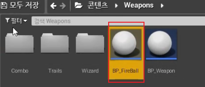 1) BP_ThrowItem > 자손 블루프린트 클래스 생성 > "BP_ThrowItem_FireBall" 생성