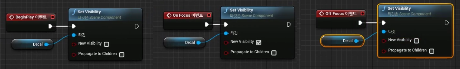 3. BP_Wizard > 이벤트 그래프 > On Selected 이벤트, Off Selected 이벤트 다음과 같이 세팅