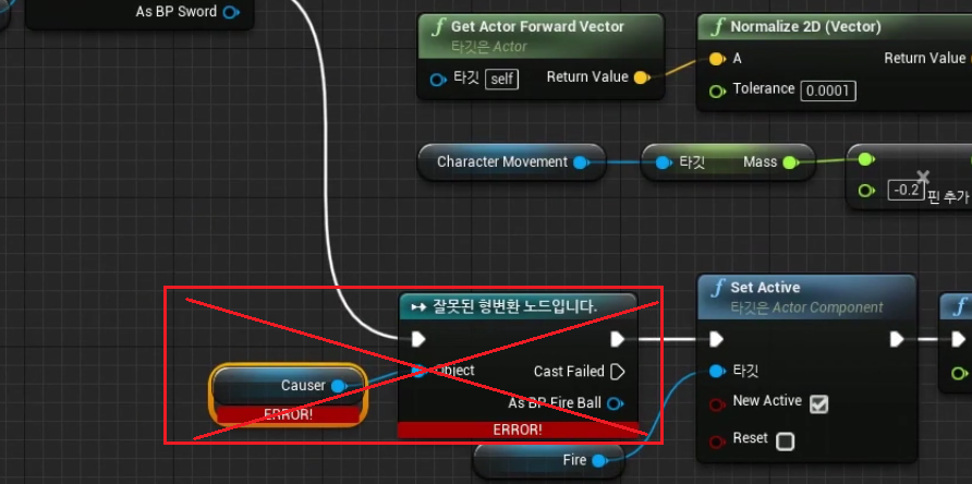 5) BP_Player > 이벤트그래프 > Attacking Event > ThrowFireBall 삭제