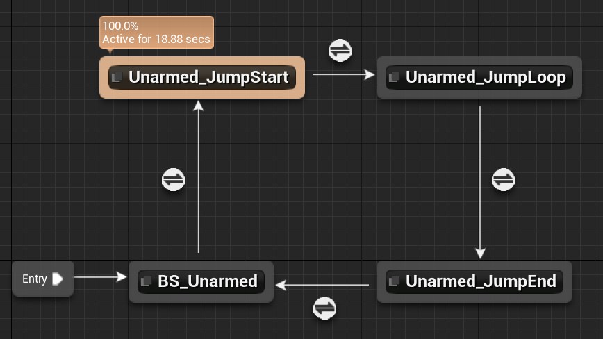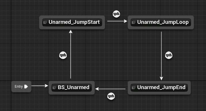 In Air 가 True 가 되면 Jump애니메이션 루틴이 실행되게 되는데, 땅이면 False 가되니까 다시 Unarmed 애니메이션을 실행하게 된다.
