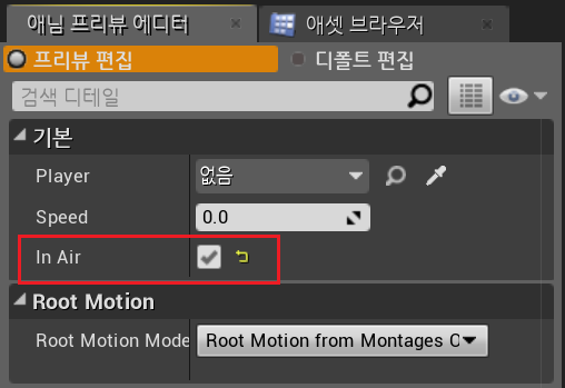 우측 에셋브라우저 옆 애님프리뷰에디터에서 In Air 체크를 하면 적용된 애니메이션을 확인 할 수 있다.