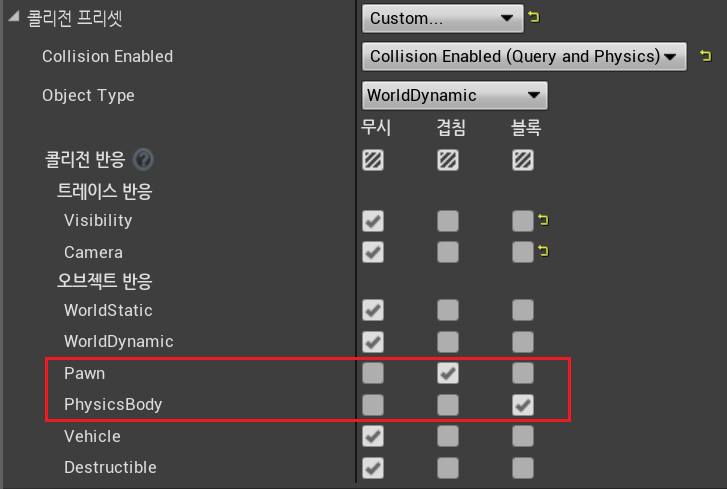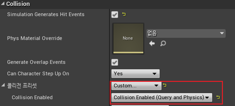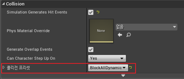 * 방금 제작했던 콜라이더 블루프린터 확인해보면 콜리전 프리셋 < "PhysicsActor (이름)" < "PhysicsBody (오브젝트 타입)" 로 되어있음