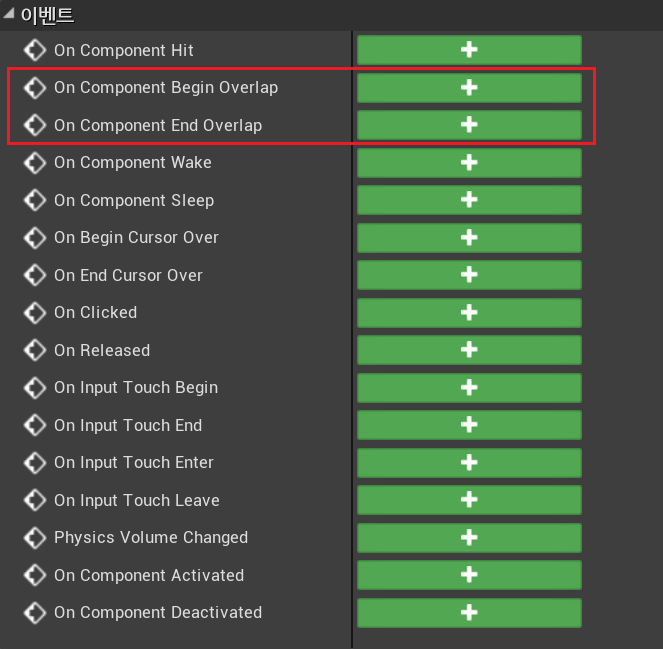 * Actor Begin Overlap : 컴포넌트 겹침보다 가볍게 쓰고 싶을 때 사용, Overlap의 조건과 마찬가지로 양쪽의 Generate Overlap이 모두 켜져 있어야 실행됨
