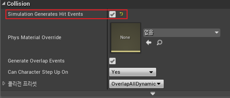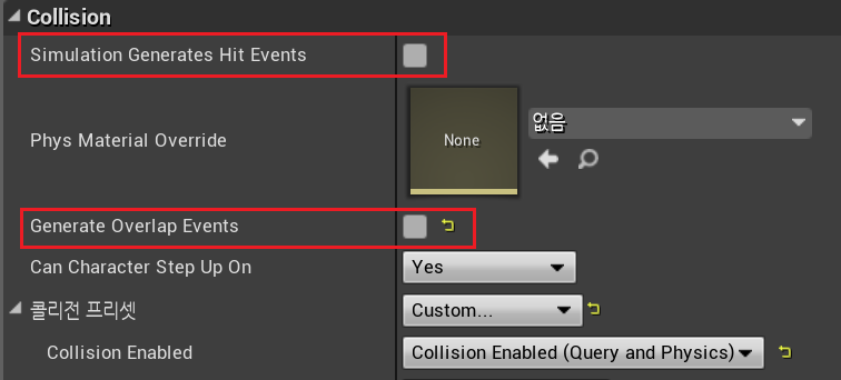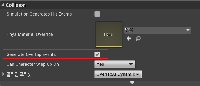 * 충돌하려는애, 충돌받으려는 애 둘다 Collision이 있어야 함, "Generate Overlap"이 켜져 있어야 함