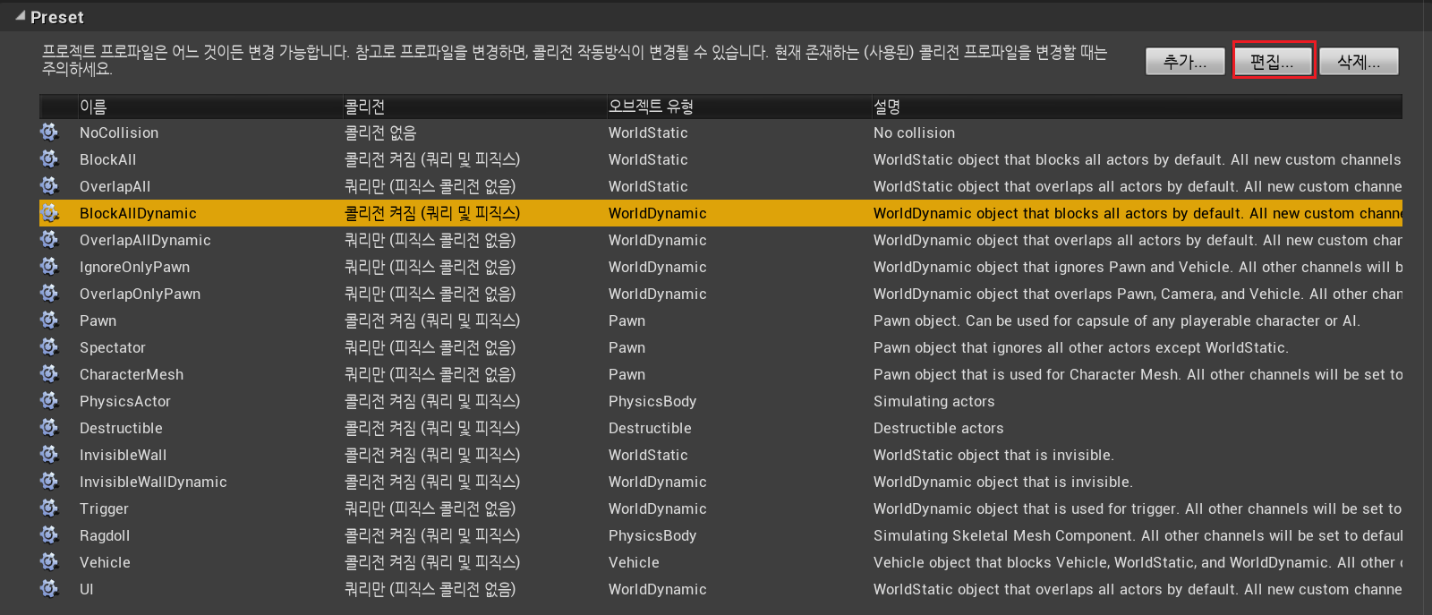 세팅 > 프로젝트 세팅 > 콜리전 > Preset(프로파일) 에서 정의 되어 있는 정보를 확인 할 수 있다.
