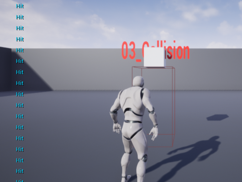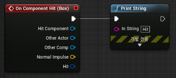 다음과 같이 "On Compenent Hit" 이벤트 함수가 발생했을때 "Hit" 로고 가 뜰 수 있도록 블루프린트를 설정한다.