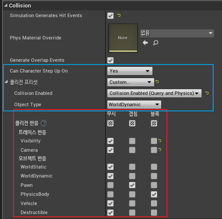 * 위의 경우에서 오버랩도 체크되어 있지만 활성화 되지 않는 이유는 "Hit" 가 발생되면서 두가지 오브젝트가 "Overlap" 되지 않기 때문입니다.