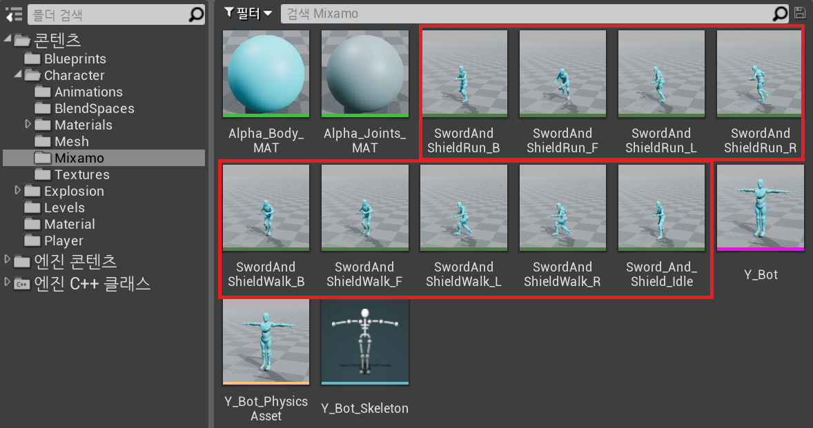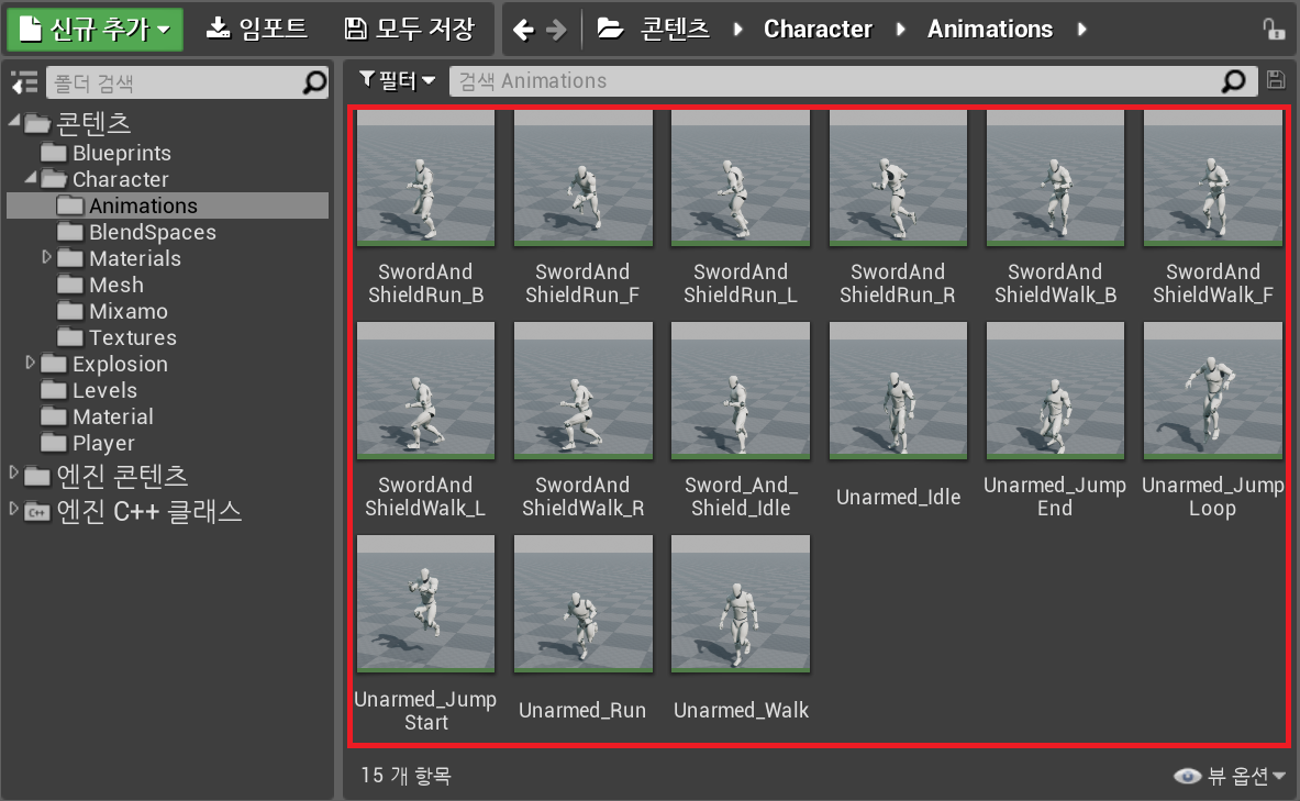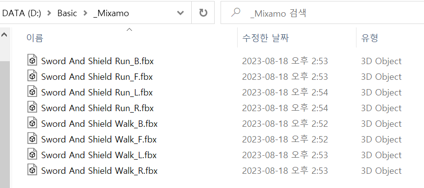 다음과 같이 애니메이션을 임포트 하고, Mixamo 폴더에 정리해 두었다.