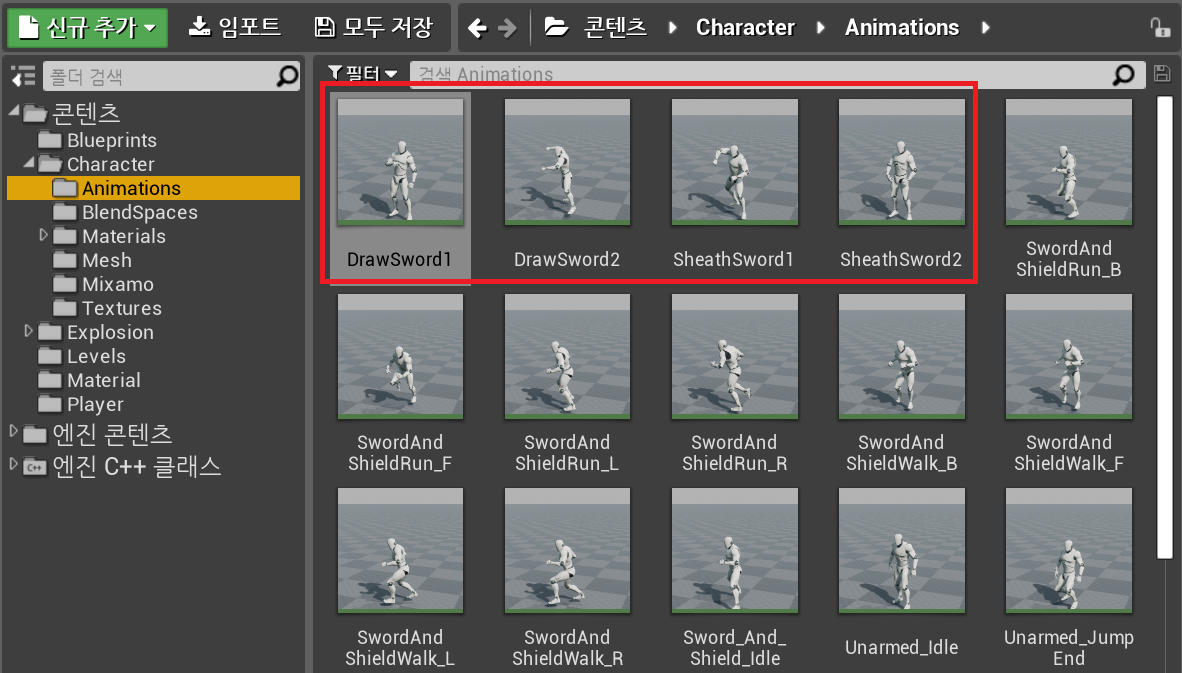 그리고 칼을 넣고 빼는 애니메이션을 Mixamo 에서 컨버트해 임포트 한다.