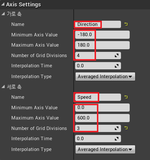 생성된 파일을 확인해 보면 블렌드 스페이스 1D와 달리 변수가 2개 활용 가능하게 들어있는 것을 확인 할 수 있다.