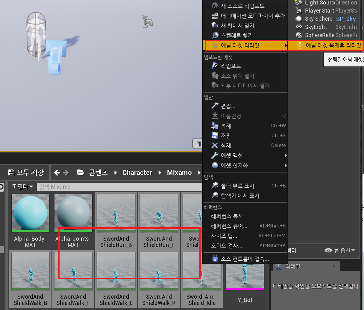 3) Ybot 캐릭터를 기반으로 한 애니메이션을 다운로드 해 오고, 애님 어셋 리타게팅 > 복제 후 리타겟팅