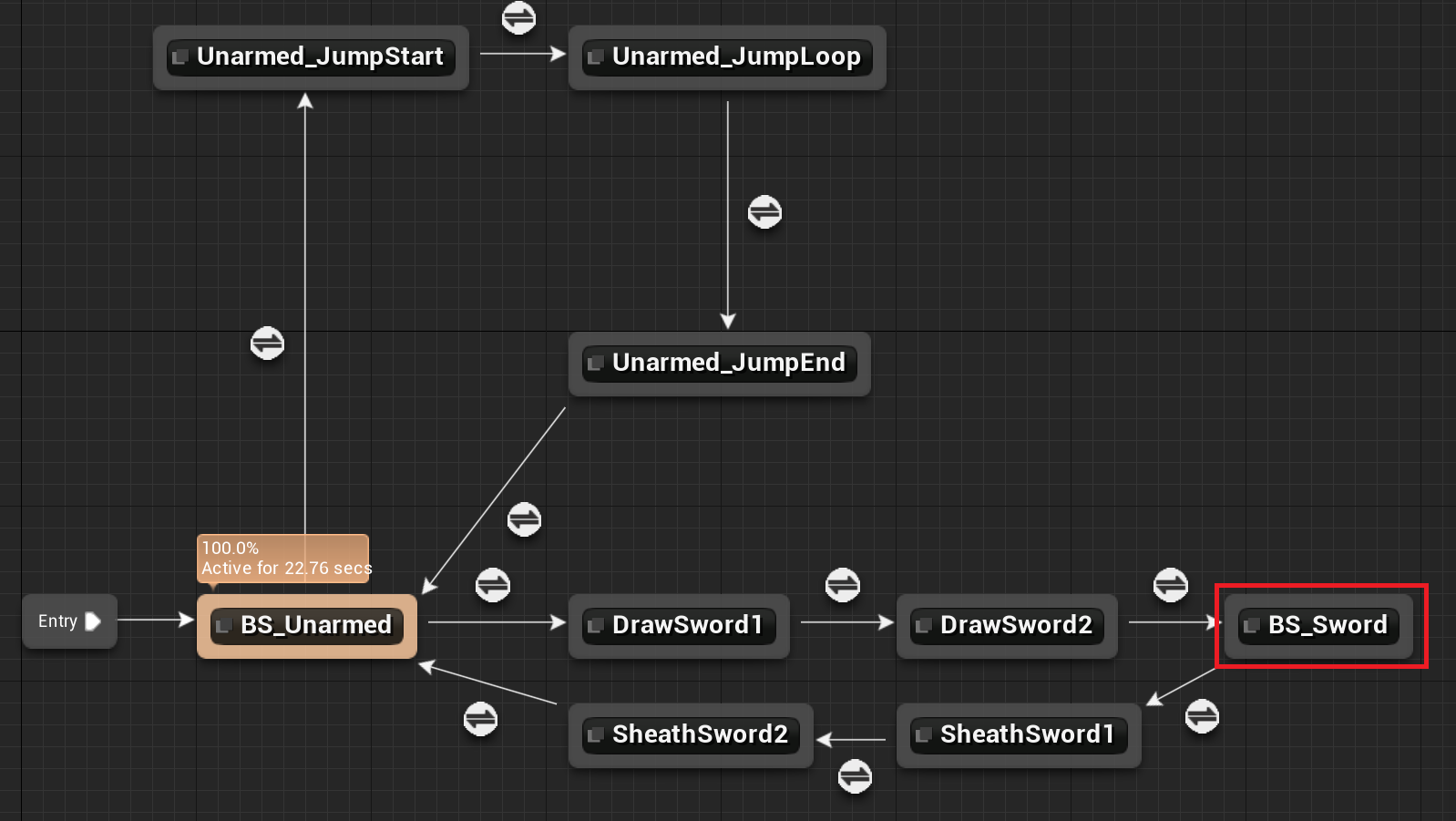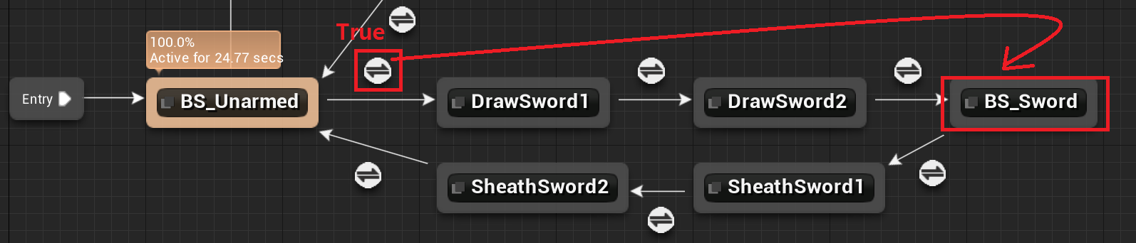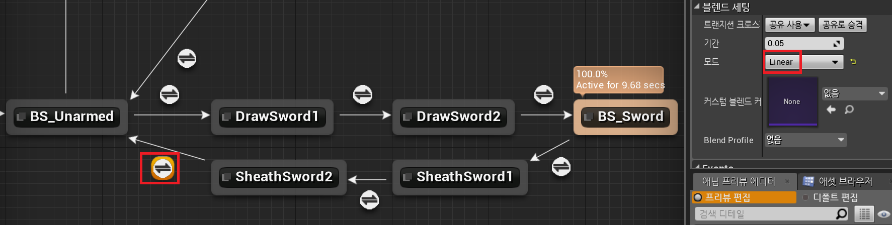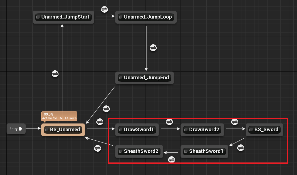 "BS_Unarmed" 에서 칼을 뽑기1, 2를 통해 "BS_Sword" 에 연결된 후