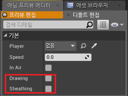 컴파일 후 애님 프리뷰 에디터 토글 활성화를 통해 검을 꺼내고 넣는 동작이 자연스럽게 연결 된 것을 확인 할 수 있다.