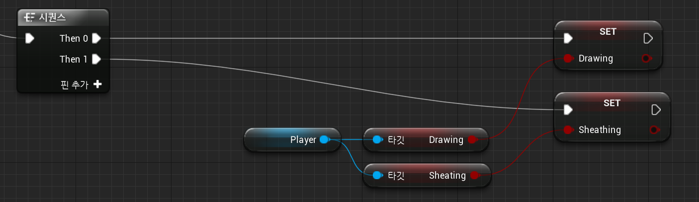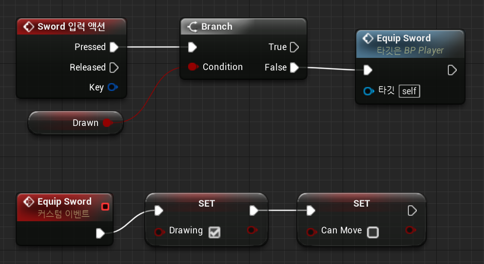 2. BP_Player 에 "Sword 입력액션" (1) 이 Pressed 되면 실행되는 Equip Sword에 Drawing 이 True 로 변함
