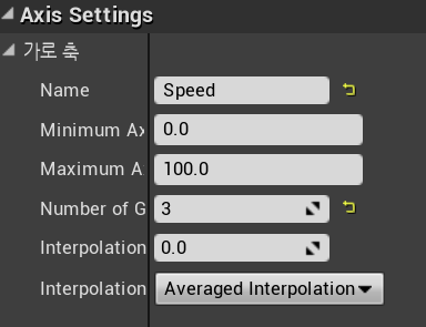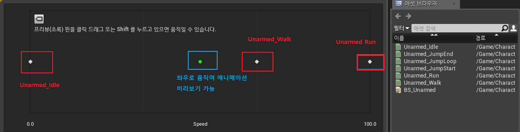 작업중인 BlendSpace 1D(한가지 변수 선택가능), "BS_Unarmed" 창에서 다음과 같이 설정