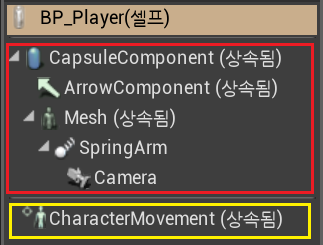 - 노란 박스 안의 "CharacterMovement (상속됨)" 는 Actor Component 만 상속받아 화면에 구현되지 않음, 데이터만 가지고 있음