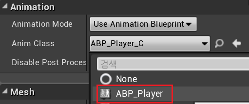 "BP_Player" > Mesh (상속됨) > Animation > 탭에서 Use Animation Blueprint, ABP_Player를 설정해준다.