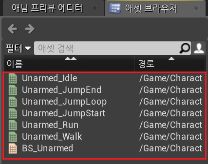우측 에셋브라우저에 임포트한 애니메이션 리스트가 뜨는데,