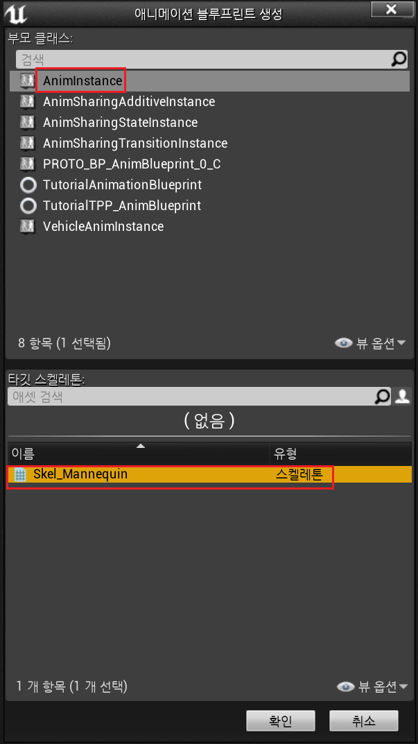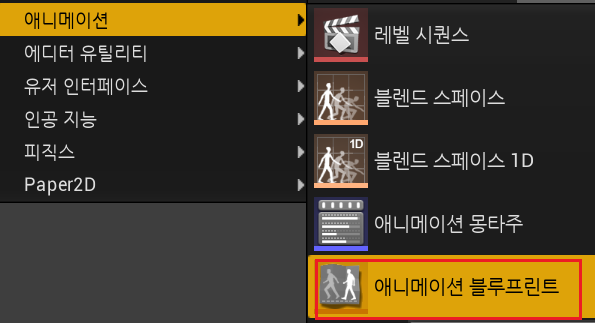 2. BluePrints폴더 > 애니메이션 블루프린트 > AnimInstance 생성 > 스켈레톤 선택 > "ABP_Player" 으로 생성