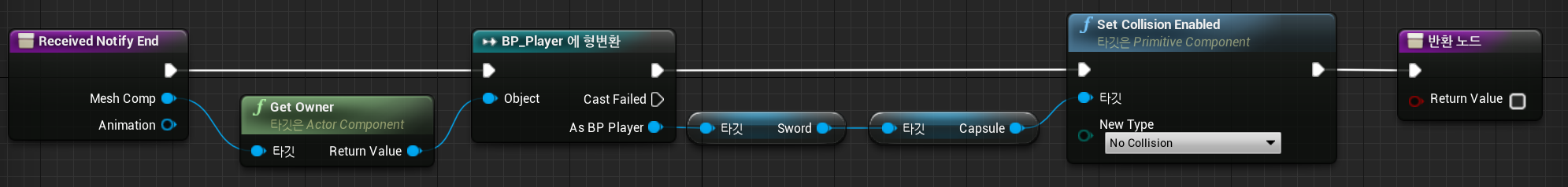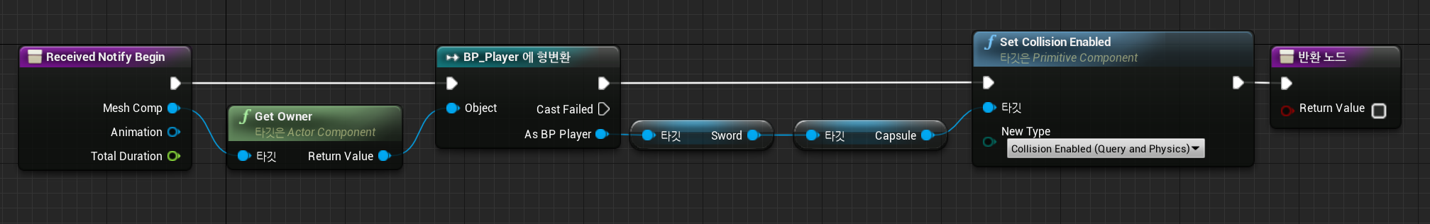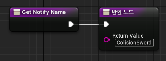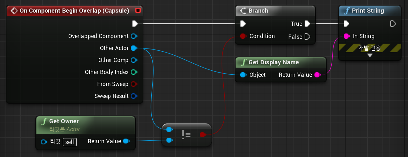 위와 같이 세팅을 마치면, 플레이어의 무기가 충돌체와 닿았을 경우, Sword 의 Owner와 같이 않을경우에 Other Actor 의 Name이 출력됨.
