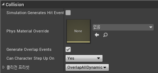 * Collision Enabled (Query and Physics) 로 설정, 겹침 다 허용 후 검출 해서 사용